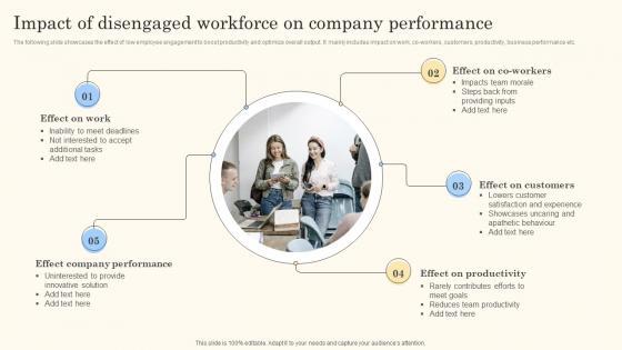 The following slide showcases the effect of low employee engagement to boost productivity and optimize overall output. It mainly includes impact on work, co workers, customers, productivity, business performance etc. Explore a selection of the finest Effective Workforce Participation Action Planning Impact Of Disengaged Workforce Background PDF here. With a plethora of professionally designed and pre made slide templates, you can quickly and easily find the right one for your upcoming presentation. You can use our Effective Workforce Participation Action Planning Impact Of Disengaged Workforce Background PDF to effectively convey your message to a wider audience. Slidegeeks has done a lot of research before preparing these presentation templates. The content can be personalized and the slides are highly editable. Grab templates today from Slidegeeks.