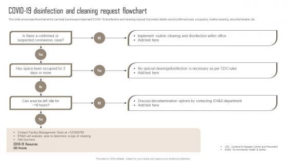 This slide showcases flowchart which can help businesses implement COVID 19 disinfection and cleaning request. It provides details about confirmed case, occupancy, routine cleaning, decontamination, etc. Do you have an important presentation coming up Are you looking for something that will make your presentation stand out from the rest Look no further than COVID 19 Disinfection And Comprehensive Guide For Building Management Information Pdf. With our professional designs, you can trust that your presentation will pop and make delivering it a smooth process. And with Slidegeeks, you can trust that your presentation will be unique and memorable. So why wait Grab COVID 19 Disinfection And Comprehensive Guide For Building Management Information Pdf today and make your presentation stand out from the rest. This slide showcases flowchart which can help businesses implement COVID 19 disinfection and cleaning request. It provides details about confirmed case, occupancy, routine cleaning, decontamination, etc.