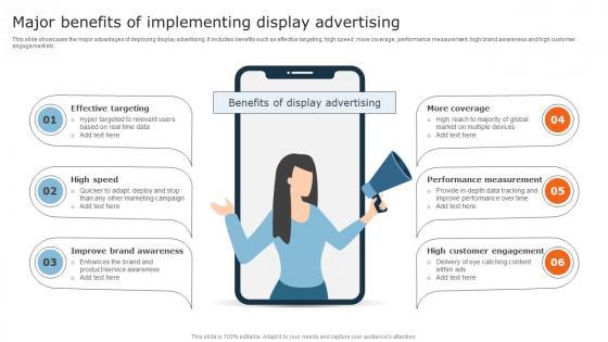This slide showcases the major advantages of deploying display advertising. It includes benefits such as effective targeting, high speed, move coverage, performance measurement, high brand awareness and high customer engagement etc. Here you can discover an assortment of the finest PowerPoint and Google Slides templates. With these templates, you can create presentations for a variety of purposes while simultaneously providing your audience with an eye catching visual experience. Download Major Benefits Of Implementing Display Advertising Sample PDF to deliver an impeccable presentation. These templates will make your job of preparing presentations much quicker, yet still, maintain a high level of quality. Slidegeeks has experienced researchers who prepare these templates and write high quality content for you. Later on, you can personalize the content by editing the Major Benefits Of Implementing Display Advertising Sample PDF.