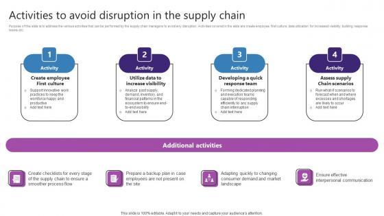 Purpose of this slide is to address the various activities that can be performed by the supply chain managers to avoid any disruption. Activities covered in the slide are create employee first culture, data utilization for increased visibility, building response teams etc. Boost your pitch with our creative Activities To Avoid Disruption In The Supply Chain Strategic Plan For Enhancing Graphics Pdf Deliver an awe-inspiring pitch that will mesmerize everyone. Using these presentation templates you will surely catch everyones attention. You can browse the ppts collection on our website. We have researchers who are experts at creating the right content for the templates. So you do not have to invest time in any additional work. Just grab the template now and use them. Purpose of this slide is to address the various activities that can be performed by the supply chain managers to avoid any disruption. Activities covered in the slide are create employee first culture, data utilization for increased visibility, building response teams etc.
