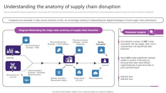 Mentioned slide depicts the stage-by-stage anatomy of various supply chain breaches such as physical disruption, service interruption, and insider threat. It also provides statistical insights into supply chain risk and investor finance misallocation.Slidegeeks has constructed Understanding The Anatomy Of Supply Chain Disruption Stand Out Digital Supply Chain Tactics Enhancing Background PDF after conducting extensive research and examination. These presentation templates are constantly being generated and modified based on user preferences and critiques from editors. Here, you will find the most attractive templates for a range of purposes while taking into account ratings and remarks from users regarding the content. This is an excellent jumping-off point to explore our content and will give new users an insight into our top-notch PowerPoint Templates.