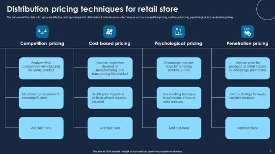 The purpose of this slide is to represent effective pricing strategies for distribution. It includes various techniques such as competition pricing, cost based pricing, psychological and penetration pricing. Pitch your topic with ease and precision using this Distribution Pricing Techniques For Retail Store Guidelines Pdf This layout presents information on Competition Pricing, Cost Based Pricing It is also available for immediate download and adjustment. So, changes can be made in the color, design, graphics or any other component to create a unique layout. The purpose of this slide is to represent effective pricing strategies for distribution. It includes various techniques such as competition pricing, cost based pricing, psychological and penetration pricing.