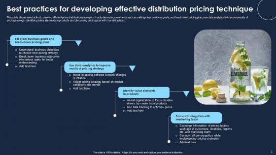 This slide showcases tactics to develop efficient price distribution strategies. It includes various elements such as setting clear business goals, and breakdown pricing plan, use data analytics to improve results of pricing strategy, identifying value elements in products and discussing pricing plan with marketing team. Showcasing this set of slides titled Best Practices For Developing Effective Distribution Pricing Technique Professional Pdf The topics addressed in these templates are Clear Business, Goals And Breakdown, Pricing Plan All the content presented in this PPT design is completely editable. Download it and make adjustments in color, background, font etc. as per your unique business setting. This slide showcases tactics to develop efficient price distribution strategies. It includes various elements such as setting clear business goals, and breakdown pricing plan, use data analytics to improve results of pricing strategy, identifying value elements in products and discussing pricing plan with marketing team.