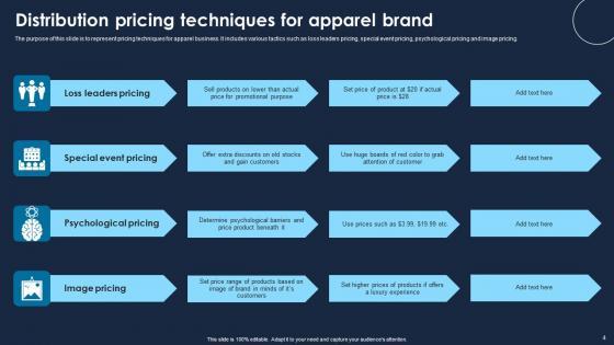 The purpose of this slide is to represent pricing techniques for apparel business. It includes various tactics such as loss leaders pricing, special event pricing, psychological pricing and image pricing. Showcasing this set of slides titled Distribution Pricing Techniques For Apparel Brand Infographics Pdf The topics addressed in these templates are Loss Leaders Pricing, Special Event Pricing All the content presented in this PPT design is completely editable. Download it and make adjustments in color, background, font etc. as per your unique business setting. The purpose of this slide is to represent pricing techniques for apparel business. It includes various tactics such as loss leaders pricing, special event pricing, psychological pricing and image pricing.