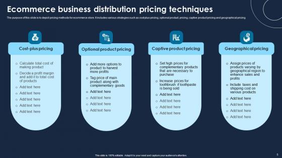 The purpose of this slide is to depict pricing methods for ecommerce store. It includes various strategies such as cost plus pricing, optional product, pricing, captive product pricing and geographical pricing. Pitch your topic with ease and precision using this Ecommerce Business Distribution Pricing Techniques Template Pdf This layout presents information on Optional Product Pricing, Captive Product Pricing, Cost Plus Pricing It is also available for immediate download and adjustment. So, changes can be made in the color, design, graphics or any other component to create a unique layout. The purpose of this slide is to depict pricing methods for ecommerce store. It includes various strategies such as cost plus pricing, optional product, pricing, captive product pricing and geographical pricing.