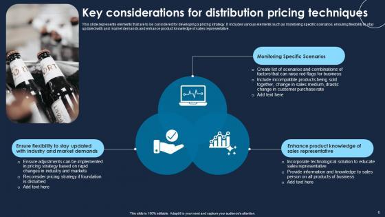 This slide represents elements that are to be considered for developing a pricing strategy. It includes various elements such as monitoring specific scenarios, ensuring flexibility to stay updated with and market demands and enhance product knowledge of sales representative. Showcasing this set of slides titled Key Considerations For Distribution Pricing Techniques Guidelines Pdf The topics addressed in these templates are Monitoring Specific Scenarios, Enhance Product, Sales Representative All the content presented in this PPT design is completely editable. Download it and make adjustments in color, background, font etc. as per your unique business setting. This slide represents elements that are to be considered for developing a pricing strategy. It includes various elements such as monitoring specific scenarios, ensuring flexibility to stay updated with and market demands and enhance product knowledge of sales representative.