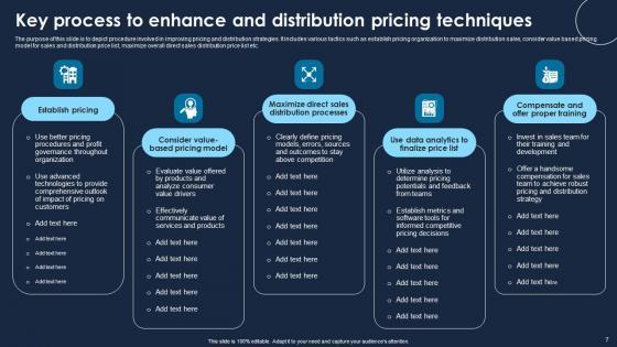 The purpose of this slide is to depict procedure involved in improving pricing and distribution strategies. It includes various tactics such as establish pricing organization to maximize distribution sales, consider value based pricing model for sales and distribution price list, maximize overall direct sales distribution price list etc. Showcasing this set of slides titled Key Process To Enhance And Distribution Pricing Techniques Diagrams Pdf The topics addressed in these templates are Establish Pricing, Distribution Processes, Data Analytics All the content presented in this PPT design is completely editable. Download it and make adjustments in color, background, font etc. as per your unique business setting. The purpose of this slide is to depict procedure involved in improving pricing and distribution strategies. It includes various tactics such as establish pricing organization to maximize distribution sales, consider value based pricing model for sales and distribution price list, maximize overall direct sales distribution price list etc.