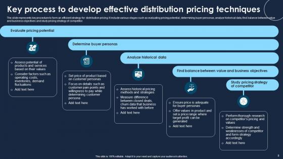 The slide represents key procedure to form an efficient strategy for distribution pricing. It include various stages such as evaluating pricing potential, determining buyer personas, analyze historical data, find balance between value and business objectives and study pricing strategy of competitor. Pitch your topic with ease and precision using this Key Process To Develop Effective Distribution Pricing Techniques Portrait Pdf This layout presents information on Evaluate Pricing Potential, Determine Buyer Personas, Analyze Historical Data It is also available for immediate download and adjustment. So, changes can be made in the color, design, graphics or any other component to create a unique layout. The slide represents key procedure to form an efficient strategy for distribution pricing. It include various stages such as evaluating pricing potential, determining buyer personas, analyze historical data, find balance between value and business objectives and study pricing strategy of competitor.