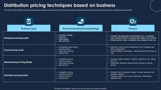 The purpose of this slide is to depict pricing strategies suitable as per business type. It covers various types of businesses such as restaurant pricing mode, event, manufacturing and education. Pitch your topic with ease and precision using this Distribution Pricing Techniques Based On Business Demonstration Pdf This layout presents information on Event Pricing Model, Manufacturing Pricing It is also available for immediate download and adjustment. So, changes can be made in the color, design, graphics or any other component to create a unique layout. The purpose of this slide is to depict pricing strategies suitable as per business type. It covers various types of businesses such as restaurant pricing mode, event, manufacturing and education.