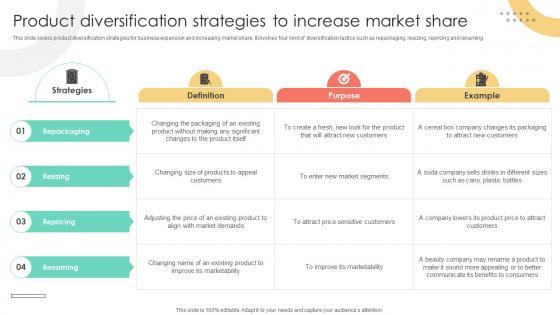 This slide covers product diversification strategies for business expansion and increasing market share. It involves four kind of diversification tactics such as repackaging, resizing, repricing and renaming. This Product Diversification Strategies To Increase Market Share PPT Presentation Strategy SS V from Slidegeeks makes it easy to present information on your topic with precision. It provides customization options, so you can make changes to the colors, design, graphics, or any other component to create a unique layout. It is also available for immediate download, so you can begin using it right away. Slidegeeks has done good research to ensure that you have everything you need to make your presentation stand out. Make a name out there for a brilliant performance. This slide covers product diversification strategies for business expansion and increasing market share. It involves four kind of diversification tactics such as repackaging, resizing, repricing and renaming.