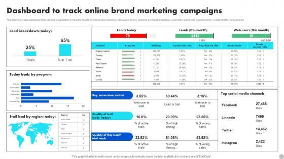 This slide showcases dashboard that can help organization to track the results of online brand marketing campaigns. Its key elements are leads breakdown,web traffic, lead to trial, organic search, website traffic, web users etc. If you are looking for a format to display your unique thoughts, then the professionally designed Dashboard To Track Online Brand Marketing Campaigns Brand Diversification Approach Information Pdf is the one for you. You can use it as a Google Slides template or a PowerPoint template. Incorporate impressive visuals, symbols, images, and other charts. Modify or reorganize the text boxes as you desire. Experiment with shade schemes and font pairings. Alter, share or cooperate with other people on your work. Download Dashboard To Track Online Brand Marketing Campaigns Brand Diversification Approach Information Pdf and find out how to give a successful presentation. Present a perfect display to your team and make your presentation unforgettable. This slide showcases dashboard that can help organization to track the results of online brand marketing campaigns. Its key elements are leads breakdown,web traffic, lead to trial, organic search, website traffic, web users etc.