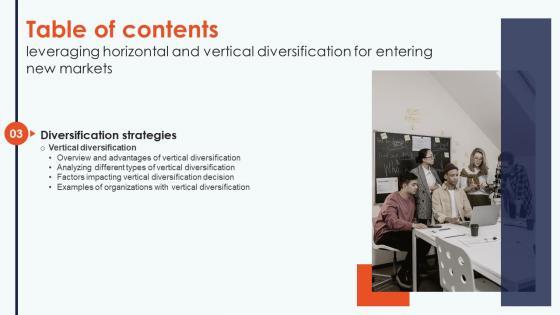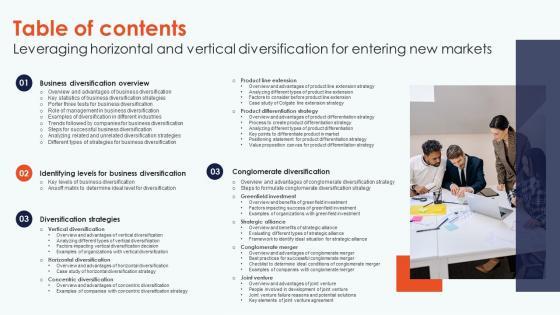 Slidegeeks is here to make your presentations a breeze with Table Of Contents Leveraging Horizontal And Vertical Diversification For Entering New Markets Clipart Pdf With our easy to use and customizable templates, you can focus on delivering your ideas rather than worrying about formatting. With a variety of designs to choose from, you are sure to find one that suits your needs. And with animations and unique photos, illustrations, and fonts, you can make your presentation pop. So whether you are giving a sales pitch or presenting to the board, make sure to check out Slidegeeks first Our Table Of Contents Leveraging Horizontal And Vertical Diversification For Entering New Markets Clipart Pdf are topically designed to provide an attractive backdrop to any subject. Use them to look like a presentation pro.