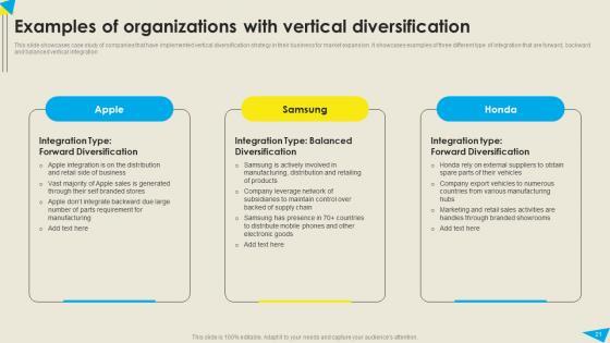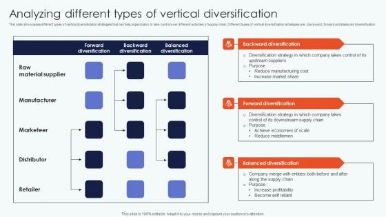 This slide showcases diversification strategy implemented by market leaders to expand their existing market size within the industry. Diversification types include Horizontal Diversification, Vertical Diversification and Conglomerate Diversification. Slidegeeks is here to make your presentations a breeze with Enterprise Leaders Technique To Achieve Market Control Strategy 1 Diversification Strategy Increase Market Size Slides PDF With our easy to use and customizable templates, you can focus on delivering your ideas rather than worrying about formatting. With a variety of designs to choose from, you are sure to find one that suits your needs. And with animations and unique photos, illustrations, and fonts, you can make your presentation pop. So whether you are giving a sales pitch or presenting to the board, make sure to check out Slidegeeks first.