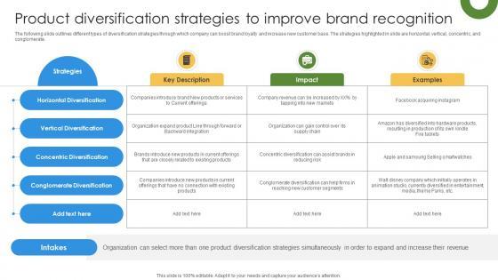 The following slide showcases various strategies for product diversification to increase sales in existing product line. It showcases strategies such as related diversification, unrelated diversification, horizontal diversification, vertical diversification and concentric diversification. Do you have to make sure that everyone on your team knows about any specific topic I yes, then you should give Strategic Brand Growth Plan For Market Leadership Product Diversification Strategies Graphics PDF a try. Our experts have put a lot of knowledge and effort into creating this impeccable Strategic Brand Growth Plan For Market Leadership Product Diversification Strategies Graphics PDF. You can use this template for your upcoming presentations, as the slides are perfect to represent even the tiniest detail. You can download these templates from the Slidegeeks website and these are easy to edit. So grab these today.