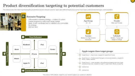 This slide provides information regarding targeting of potential products to relevant customer. Apple caters different target group such as music lovers, professionals and teenagers, urban population. Do you know about Slidesgeeks Product Diversification Targeting Apple Branding Strategy To Become Market Leader Brochure Pdf These are perfect for delivering any kind od presentation. Using it, create PowerPoint presentations that communicate your ideas and engage audiences. Save time and effort by using our pre designed presentation templates that are perfect for a wide range of topic. Our vast selection of designs covers a range of styles, from creative to business, and are all highly customizable and easy to edit. Download as a PowerPoint template or use them as Google Slides themes. This slide provides information regarding targeting of potential products to relevant customer. Apple caters different target group such as music lovers, professionals and teenagers, urban population.