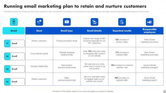 This slide showcases email marketing plan that can help organization to retain customers after new brand launch. Its key elements are email, goal, email type, email details, expected results and responsible employee for email promotion. Do you have to make sure that everyone on your team knows about any specific topic I yes, then you should give Running Email Marketing Plan To Retain And Nurture Brand Diversification Approach Download Pdf a try. Our experts have put a lot of knowledge and effort into creating this impeccable Running Email Marketing Plan To Retain And Nurture Brand Diversification Approach Download Pdf You can use this template for your upcoming presentations, as the slides are perfect to represent even the tiniest detail. You can download these templates from the Slidegeeks website and these are easy to edit. So grab these today. This slide showcases email marketing plan that can help organization to retain customers after new brand launch. Its key elements are email, goal, email type, email details, expected results and responsible employee for email promotion.