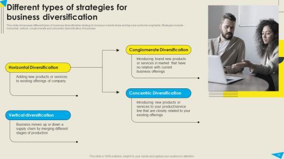 The following slide outlines different types of diversification strategies through which company can boost brand loyalty and increase new customer base. The strategies highlighted in slide are horizontal, vertical, concentric, and conglomerate. Find a pre-designed and impeccable Marketing Growth Strategy Product Diversification Strategies To Improve Brand Strategy SS V. The templates can ace your presentation without additional effort. You can download these easy-to-edit presentation templates to make your presentation stand out from others. So, what are you waiting for Download the template from Slidegeeks today and give a unique touch to your presentation. The following slide outlines different types of diversification strategies through which company can boost brand loyalty and increase new customer base. The strategies highlighted in slide are horizontal, vertical, concentric, and conglomerate.