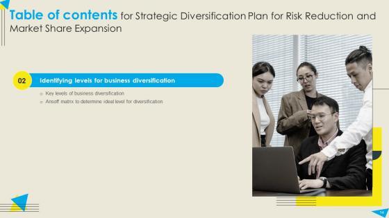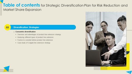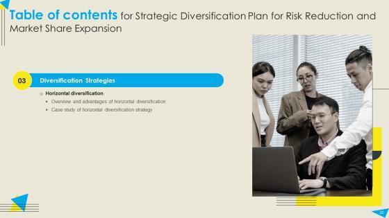 Do you have an important presentation coming up Are you looking for something that will make your presentation stand out from the rest Look no further than Table Of Contents For Strategic Diversification Plan For Risk Reduction And Market Demonstration PDF. With our professional designs, you can trust that your presentation will pop and make delivering it a smooth process. And with Slidegeeks, you can trust that your presentation will be unique and memorable. So why wait Grab Table Of Contents For Strategic Diversification Plan For Risk Reduction And Market Demonstration PDF today and make your presentation stand out from the rest Our Table Of Contents For Strategic Diversification Plan For Risk Reduction And Market Demonstration PDF are topically designed to provide an attractive backdrop to any subject. Use them to look like a presentation pro.