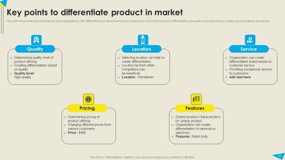 This slide showcases different levels of business diversification that can help organization to manage the market risk and increase business revenue. Three different levels for business diversification are low, moderate and high. The best PPT templates are a great way to save time, energy, and resources. Slidegeeks have 100 percent editable powerpoint slides making them incredibly versatile. With these quality presentation templates, you can create a captivating and memorable presentation by combining visually appealing slides and effectively communicating your message. Download Key Points To Differentiate Product In Market Strategic Diversification Plan Guidelines PDF from Slidegeeks and deliver a wonderful presentation. This slide showcases different levels of business diversification that can help organization to manage the market risk and increase business revenue. Three different levels for business diversification are low, moderate and high.