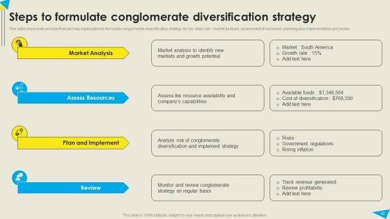 This slide showcases process that can help organization to formulate conglomerate diversification strategy. Its key steps are market analysis, assessment of resources, planning plus implementation and review. From laying roadmaps to briefing everything in detail, our templates are perfect for you. You can set the stage with your presentation slides. All you have to do is download these easy-to-edit and customizable templates. Strategic Diversification Plan For Risk Reduction And Market Table Of Contents Microsoft PDF will help you deliver an outstanding performance that everyone would remember and praise you for. Do download this presentation today. This slide showcases process that can help organization to formulate conglomerate diversification strategy. Its key steps are market analysis, assessment of resources, planning plus implementation and review.