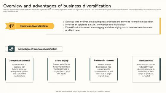 This slide showcases business diversification that can help organization to tap new market segment and increase the organizational revenue. It also showcases advantages of business diversification that are competitive defence, increase in revenue, brand equity and reduced risk. Slidegeeks is here to make your presentations a breeze with Overview And Advantages Of Business Diversification Market Expansion Through Guidelines Pdf With our easy-to-use and customizable templates, you can focus on delivering your ideas rather than worrying about formatting. With a variety of designs to choose from, you are sure to find one that suits your needs. And with animations and unique photos, illustrations, and fonts, you can make your presentation pop. So whether you are giving a sales pitch or presenting to the board, make sure to check out Slidegeeks first. This slide showcases business diversification that can help organization to tap new market segment and increase the organizational revenue. It also showcases advantages of business diversification that are competitive defence, increase in revenue, brand equity and reduced risk.