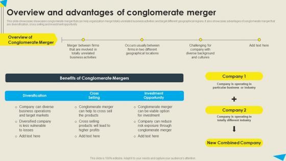 This slides showcases conglomerate diversification strategy that can help organization introduce new products and mitigate the business risk. It also showcases advantages of conglomerate diversification that are attract new customer base, diversification of business risk, increase in revenue etc Do you know about Slidesgeeks Overview And Advantages Conglomerate Leveraging Horizontal Vertical Diversification Entering Information Pdf These are perfect for delivering any kind od presentation. Using it, create PowerPoint presentations that communicate your ideas and engage audiences. Save time and effort by using our pre designed presentation templates that are perfect for a wide range of topic. Our vast selection of designs covers a range of styles, from creative to business, and are all highly customizable and easy to edit. Download as a PowerPoint template or use them as Google Slides themes. This slides showcases conglomerate diversification strategy that can help organization introduce new products and mitigate the business risk. It also showcases advantages of conglomerate diversification that are attract new customer base, diversification of business risk, increase in revenue etc