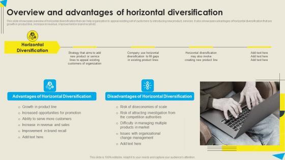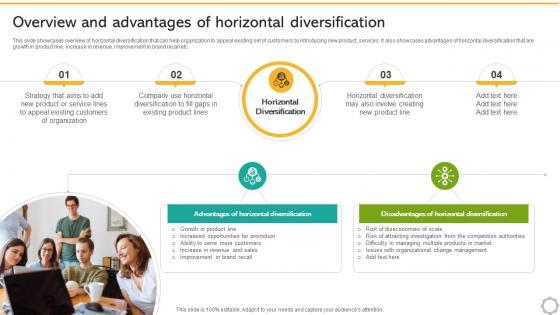 This slide showcases overview of horizontal diversification that can help organization to appeal existing set of customers by introducing new product, services. It also showcases advantages of horizontal diversification that are growth in product line, increase in revenue, improvement in brand recall etc Slidegeeks has constructed Overview Advantages Horizontal Leveraging Horizontal Vertical Diversification Entering Professional Pdf after conducting extensive research and examination. These presentation templates are constantly being generated and modified based on user preferences and critiques from editors. Here, you will find the most attractive templates for a range of purposes while taking into account ratings and remarks from users regarding the content. This is an excellent jumping off point to explore our content and will give new users an insight into our top notch PowerPoint Templates. This slide showcases overview of horizontal diversification that can help organization to appeal existing set of customers by introducing new product, services. It also showcases advantages of horizontal diversification that are growth in product line, increase in revenue, improvement in brand recall etc