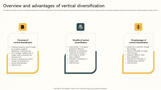 This slide showcases overview of vertical diversification that can help organization to control different stages of supply chain and diversify risk. It also showcases benefits of vertical diversification that are improved efficiency, customer loyalty and better control. Make sure to capture your audiences attention in your business displays with our gratis customizable Overview And Advantages Of Vertical Diversification Market Expansion Through Information Pdf These are great for business strategies, office conferences, capital raising or task suggestions. If you desire to acquire more customers for your tech business and ensure they stay satisfied, create your own sales presentation with these plain slides. This slide showcases overview of vertical diversification that can help organization to control different stages of supply chain and diversify risk. It also showcases benefits of vertical diversification that are improved efficiency, customer loyalty and better control.