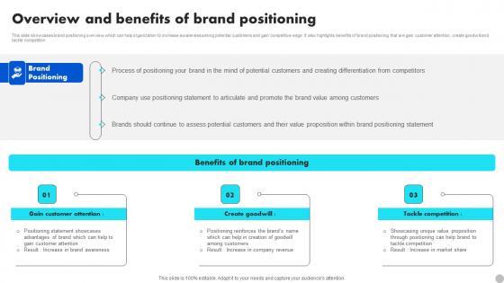 This slide showcases brand positioning overview which can help organization to increase awareness among potential customers and gain competitive edge. It also highlights benefits of brand positioning that are gain customer attention, create goodwill and tackle competition. Presenting this PowerPoint presentation, titled Overview And Benefits Of Brand Positioning Brand Diversification Approach Rules Pdf with topics curated by our researchers after extensive research. This editable presentation is available for immediate download and provides attractive features when used. Download now and captivate your audience. Presenting this Overview And Benefits Of Brand Positioning Brand Diversification Approach Rules Pdf Our researchers have carefully researched and created these slides with all aspects taken into consideration. This is a completely customizable Overview And Benefits Of Brand Positioning Brand Diversification Approach Rules Pdf that is available for immediate downloading. Download now and make an impact on your audience. Highlight the attractive features available with our PPTs. This slide showcases brand positioning overview which can help organization to increase awareness among potential customers and gain competitive edge. It also highlights benefits of brand positioning that are gain customer attention, create goodwill and tackle competition.