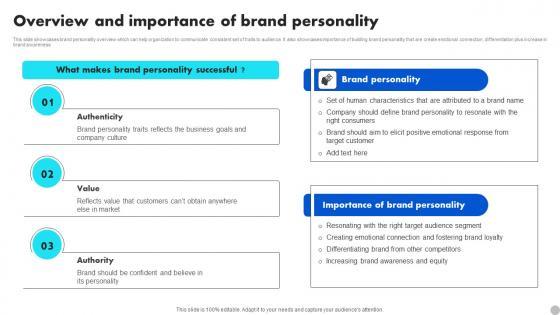 This slide showcases brand personality overview which can help organization to communicate consistent set of traits to audience. It also showcases importance of building brand personality that are create emotional connection, differentiation plus increase in brand awareness. This Overview And Importance Of Brand Personality Brand Diversification Approach Template Pdf from Slidegeeks makes it easy to present information on your topic with precision. It provides customization options, so you can make changes to the colors, design, graphics, or any other component to create a unique layout. It is also available for immediate download, so you can begin using it right away. Slidegeeks has done good research to ensure that you have everything you need to make your presentation stand out. Make a name out there for a brilliant performance. This slide showcases brand personality overview which can help organization to communicate consistent set of traits to audience. It also showcases importance of building brand personality that are create emotional connection, differentiation plus increase in brand awareness.