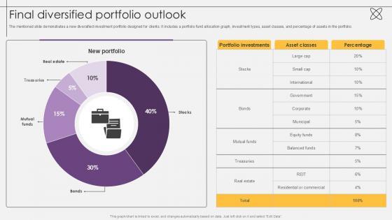 The mentioned slide demonstrates a new diversified investment portfolio designed for clients.It includes a portfolio fund allocation graph, investment types, asset classes, and percentage of assets in the portfolio. If your project calls for a presentation, then Slidegeeks is your go to partner because we have professionally designed, easy to edit templates that are perfect for any presentation. After downloading, you can easily edit Final Diversified Portfolio Outlook Investment Fund PPT PowerPoint and make the changes accordingly. You can rearrange slides or fill them with different images. Check out all the handy templates The mentioned slide demonstrates a new diversified investment portfolio designed for clients.It includes a portfolio fund allocation graph, investment types, asset classes, and percentage of assets in the portfolio.