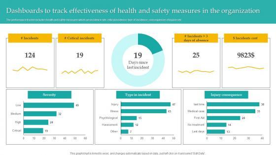 The performance tracker includes health and safety measures which are incidence rate, critical incidence, type of incidence, consequences of injuries etc. Slidegeeks is here to make your presentations a breeze with Dashboards Track Effectiveness Administering Diversity And Inclusion At Workplace Themes Pdf With our easy to use and customizable templates, you can focus on delivering your ideas rather than worrying about formatting. With a variety of designs to choose from, you are sure to find one that suits your needs. And with animations and unique photos, illustrations, and fonts, you can make your presentation pop. So whether you are giving a sales pitch or presenting to the board, make sure to check out Slidegeeks first The performance tracker includes health and safety measures which are incidence rate, critical incidence, type of incidence, consequences of injuries etc.