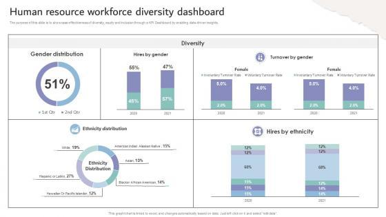The purpose of this slide is to showcase effectiveness of diversity, equity and inclusion through a KPI Dashboard by enabling data-driven insights. Make sure to capture your audiences attention in your business displays with our gratis customizable Inclusive Workplace Training Program Human Resource Workforce Diversity Dashboard DTE SS V. These are great for business strategies, office conferences, capital raising or task suggestions. If you desire to acquire more customers for your tech business and ensure they stay satisfied, create your own sales presentation with these plain slides. The purpose of this slide is to showcase effectiveness of diversity, equity and inclusion through a KPI Dashboard by enabling data-driven insights.