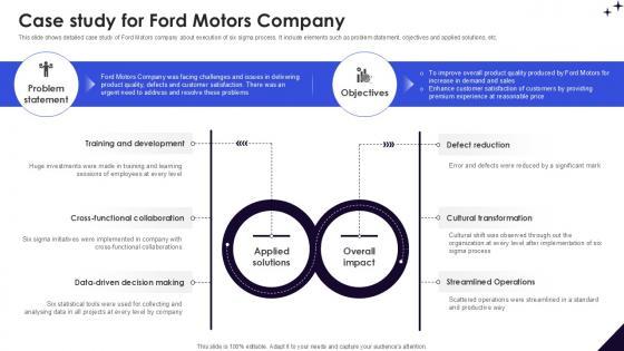 This slide shows detailed case study of Ford Motors company about execution of six sigma process. It include elements such as problem statement, objectives and applied solutions, etc. Do you have to make sure that everyone on your team knows about any specific topic I yes, then you should give Case Study For Ford Motors DMAIC Methodology To Maintain PPT Template a try. Our experts have put a lot of knowledge and effort into creating this impeccable Case Study For Ford Motors DMAIC Methodology To Maintain PPT Template. You can use this template for your upcoming presentations, as the slides are perfect to represent even the tiniest detail. You can download these templates from the Slidegeeks website and these are easy to edit. So grab these today This slide shows detailed case study of Ford Motors company about execution of six sigma process. It include elements such as problem statement, objectives and applied solutions, etc.