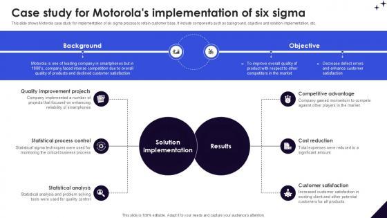 This slide shows Motorola case study for implementation of six sigma process to retain customer base. It include components such as background, objective and solution implementation, etc. Get a simple yet stunning designed Case Study For Motorolas DMAIC Methodology To Maintain PPT Example. It is the best one to establish the tone in your meetings. It is an excellent way to make your presentations highly effective. So, download this PPT today from Slidegeeks and see the positive impacts. Our easy-to-edit Case Study For Motorolas DMAIC Methodology To Maintain PPT Example can be your go-to option for all upcoming conferences and meetings. So, what are you waiting for Grab this template today. This slide shows Motorola case study for implementation of six sigma process to retain customer base. It include components such as background, objective and solution implementation, etc.