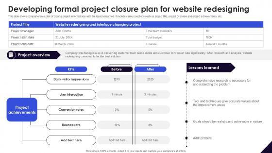 This slide shows comprehensive plan of closing project in formal way with the lessons learned. It include various sections such as project title, project overview and project achievements, etc. Whether you have daily or monthly meetings, a brilliant presentation is necessary. Developing Formal Project Closure DMAIC Methodology To Maintain PPT Slide can be your best option for delivering a presentation. Represent everything in detail using Developing Formal Project Closure DMAIC Methodology To Maintain PPT Slide and make yourself stand out in meetings. The template is versatile and follows a structure that will cater to your requirements. All the templates prepared by Slidegeeks are easy to download and edit. Our research experts have taken care of the corporate themes as well. So, give it a try and see the results. This slide shows comprehensive plan of closing project in formal way with the lessons learned. It include various sections such as project title, project overview and project achievements, etc.