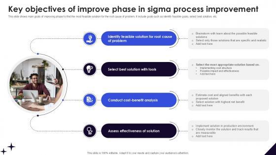This slide shows main goals of improving phase to find the most feasible solution for the root cause of problem. It include goals such as identify feasible goals, select best solution, etc. Make sure to capture your audiences attention in your business displays with our gratis customizable Key Objectives Of Improve Phase In DMAIC Methodology To Maintain PPT Template. These are great for business strategies, office conferences, capital raising or task suggestions. If you desire to acquire more customers for your tech business and ensure they stay satisfied, create your own sales presentation with these plain slides. This slide shows main goals of improving phase to find the most feasible solution for the root cause of problem. It include goals such as identify feasible goals, select best solution, etc.