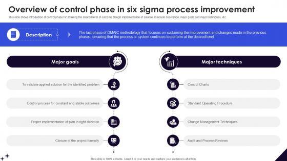This slide shows introduction of control phase for attaining the desired level of outcome though implementation of solution. It include description, major goals and major techniques, etc. Are you searching for a Overview Of Control Phase In DMAIC Methodology To Maintain PPT Slide that is uncluttered, straightforward, and original Its easy to edit, and you can change the colors to suit your personal or business branding. For a presentation that expresses how much effort you have put in, this template is ideal With all of its features, including tables, diagrams, statistics, and lists, its perfect for a business plan presentation. Make your ideas more appealing with these professional slides. Download Overview Of Control Phase In DMAIC Methodology To Maintain PPT Slide from Slidegeeks today. This slide shows introduction of control phase for attaining the desired level of outcome though implementation of solution. It include description, major goals and major techniques, etc.