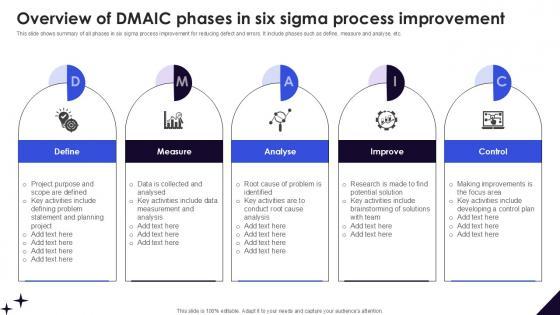 This slide shows introduction of six sigma process improvement for optimizing business functions. It includes description, importance and phases of six sigma process. This Overview Of Six Sigma Process DMAIC Methodology To Maintain PPT Presentation from Slidegeeks makes it easy to present information on your topic with precision. It provides customization options, so you can make changes to the colors, design, graphics, or any other component to create a unique layout. It is also available for immediate download, so you can begin using it right away. Slidegeeks has done good research to ensure that you have everything you need to make your presentation stand out. Make a name out there for a brilliant performance. This slide shows introduction of six sigma process improvement for optimizing business functions. It includes description, importance and phases of six sigma process.