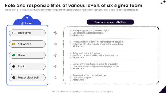 This slide shows role and responsibilities of various team members working at different levels in organization. It include role and responsibilities related to project selection, progress tracking, etc. Retrieve professionally designed Role And Responsibilities At Various DMAIC Methodology To Maintain PPT Template to effectively convey your message and captivate your listeners. Save time by selecting pre-made slideshows that are appropriate for various topics, from business to educational purposes. These themes come in many different styles, from creative to corporate, and all of them are easily adjustable and can be edited quickly. Access them as PowerPoint templates or as Google Slides themes. You do not have to go on a hunt for the perfect presentation because Slidegeeks got you covered from everywhere. This slide shows role and responsibilities of various team members working at different levels in organization. It include role and responsibilities related to project selection, progress tracking, etc.