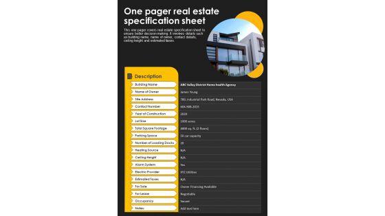 Heres a predesigned One Pager Real Estate Specification Sheet PDF Document PPT Template for you. Built on extensive research and analysis, this one-pager template has all the centerpieces of your specific requirements. This temple exudes brilliance and professionalism. Being completely editable, you can make changes to suit your purpose. Get this One Pager Real Estate Specification Sheet PDF Document PPT Template Download now. Our One Pager Real Estate Specification Sheet PDF Document PPT Template are topically designed to provide an attractive backdrop to any subject. Use them to look like a presentation pro.