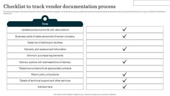 This slide showcases a checklist to keep track of documents and files of supplier. It includes items such as updated product price list with descriptions, Business cards of sales personnel of vendor company, Detail list of distribution facilities etc. Pitch your topic with ease and precision using this Checklist To Track Vendor Documentation Process Infographics Pdf. This layout presents information on Item. It is also available for immediate download and adjustment. So, changes can be made in the color, design, graphics or any other component to create a unique layout. This slide showcases a checklist to keep track of documents and files of supplier. It includes items such as updated product price list with descriptions, Business cards of sales personnel of vendor company, Detail list of distribution facilities etc.