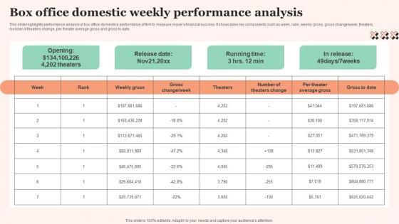 This slide highlights performance analysis of box office domestics performance of film to measure movies financial success. It showcases key components such as week, rank, weekly gross, gross change week, theaters, number of theaters change, per theater average gross and gross to date. This modern and well arranged Box Office Domestic Weekly Film Promotional Techniques To Increase Box Office Collection Introduction Pdf provides lots of creative possibilities. It is very simple to customize and edit with the Powerpoint Software. Just drag and drop your pictures into the shapes. All facets of this template can be edited with Powerpoint, no extra software is necessary. Add your own material, put your images in the places assigned for them, adjust the colors, and then you can show your slides to the world, with an animated slide included. This slide highlights performance analysis of box office domestics performance of film to measure movies financial success. It showcases key components such as week, rank, weekly gross, gross change week, theaters, number of theaters change, per theater average gross and gross to date.