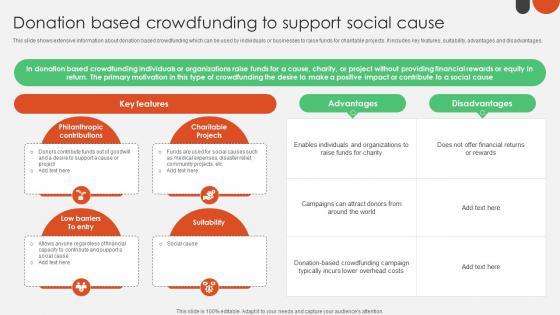 This slide shows extensive information about donation based crowdfunding which can be used by individuals or businesses to raise funds for charitable projects. It includes key features, suitability, advantages and disadvantages. If you are looking for a format to display your unique thoughts, then the professionally designed Donation Based Crowdfunding To Support Social Cause Crowdfunding Strategies To Raise Funds Fin SS V is the one for you. You can use it as a Google Slides template or a PowerPoint template. Incorporate impressive visuals, symbols, images, and other charts. Modify or reorganize the text boxes as you desire. Experiment with shade schemes and font pairings. Alter, share or cooperate with other people on your work. Download Donation Based Crowdfunding To Support Social Cause Crowdfunding Strategies To Raise Funds Fin SS V and find out how to give a successful presentation. Present a perfect display to your team and make your presentation unforgettable. This slide shows extensive information about donation based crowdfunding which can be used by individuals or businesses to raise funds for charitable projects. It includes key features, suitability, advantages and disadvantages.