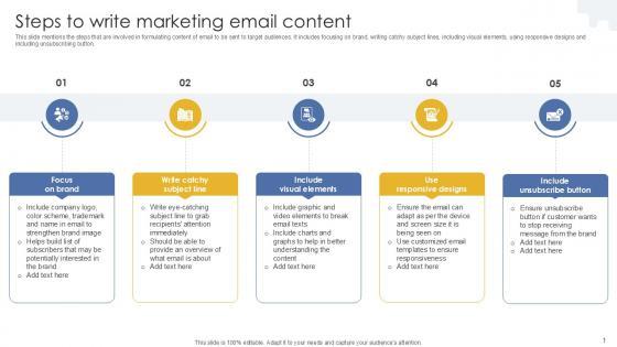 This slide mentions the steps that are involved in formulating content of email to be sent to target audiences. It includes focusing on brand, writing catchy subject lines, including visual elements, using responsive designs and including unsubscribing button. Slidegeeks has constructed Steps To Write Marketing Formulating Drip Email Marketing PPT Presentation MKT SS V after conducting extensive research and examination. These presentation templates are constantly being generated and modified based on user preferences and critiques from editors. Here, you will find the most attractive templates for a range of purposes while taking into account ratings and remarks from users regarding the content. This is an excellent jumping-off point to explore our content and will give new users an insight into our top-notch PowerPoint Templates. This slide mentions the steps that are involved in formulating content of email to be sent to target audiences. It includes focusing on brand, writing catchy subject lines, including visual elements, using responsive designs and including unsubscribing button.