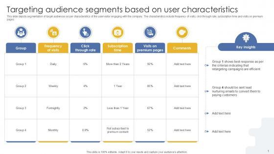 This slide depicts segmentation of target audiences as per characteristics of the user visitor engaging with the company. The characteristics include frequency of visits, click through rate, subscription time and visits on premium pages. This Targeting Audience Segments Based Formulating Drip Email Marketing PPT Presentation MKT SS V from Slidegeeks makes it easy to present information on your topic with precision. It provides customization options, so you can make changes to the colors, design, graphics, or any other component to create a unique layout. It is also available for immediate download, so you can begin using it right away. Slidegeeks has done good research to ensure that you have everything you need to make your presentation stand out. Make a name out there for a brilliant performance. This slide depicts segmentation of target audiences as per characteristics of the user visitor engaging with the company. The characteristics include frequency of visits, click through rate, subscription time and visits on premium pages.