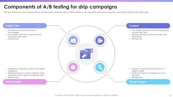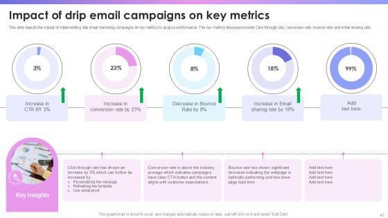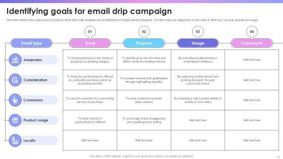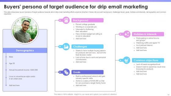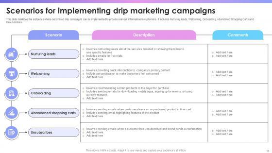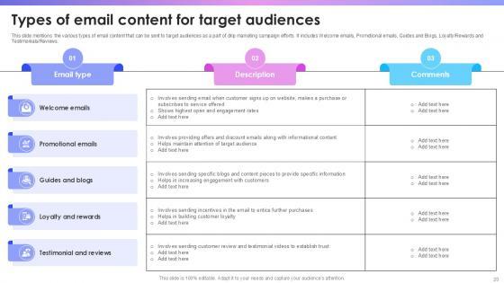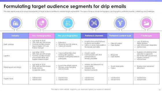 If designing a presentation takes a lot of your time and resources and you are looking for a better alternative, then this Drip Email Marketing Ppt PowerPoint Presentation Complete Deck With Slides is the right fit for you. This is a prefabricated set that can help you deliver a great presentation on the topic. All the nineteen slides included in this sample template can be used to present a birds-eye view of the topic. These slides are also fully editable, giving you enough freedom to add specific details to make this layout more suited to your business setting. Apart from the content, all other elements like color, design, theme are also replaceable and editable. This helps in designing a variety of presentations with a single layout. Not only this, you can use this PPT design in formats like PDF, PNG, and JPG once downloaded. Therefore, without any further ado, download and utilize this sample presentation as per your liking.