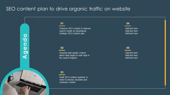 Boost your pitch with our creative Agenda Seo Content Plan To Drive Organic Traffic On Website Strategy SS V Deliver an awe-inspiring pitch that will mesmerize everyone. Using these presentation templates you will surely catch everyones attention. You can browse the ppts collection on our website. We have researchers who are experts at creating the right content for the templates. So you do not have to invest time in any additional work. Just grab the template now and use them. Our Agenda Seo Content Plan To Drive Organic Traffic On Website Strategy SS V are topically designed to provide an attractive backdrop to any subject. Use them to look like a presentation pro.