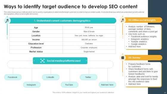 This template covers guidelines to drive unpaid traffic with Search engine optimization. It also depicts that SEO is the process of optimizing webpages so that they rank higher in search engines and maintain web page content quality Present like a pro with Target Marketing Techniques Drive Organic Traffic With Seo And Maintaining Web Page Content Quality Ideas PDFCreate beautiful presentations together with your team, using our easy to use presentation slides. Share your ideas in real time and make changes on the fly by downloading our templates. So whether you are in the office, on the go, or in a remote location, you can stay in sync with your team and present your ideas with confidence. With Slidegeeks presentation got a whole lot easier. Grab these presentations today.