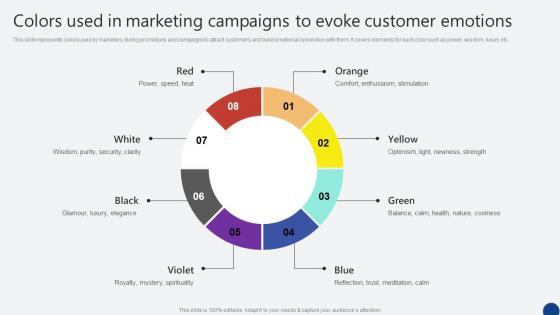This slide represents colors used by marketers during promotions and campaigns to attract customers and build emotional connection with them. It covers elements for each color such as power, wisdom, luxury etc. Create an editable Colors Used In Marketing Campaigns To Evoke Driven Digital Marketing Download Pdf that communicates your idea and engages your audience. Whether you are presenting a business or an educational presentation, pre-designed presentation templates help save time. Colors Used In Marketing Campaigns To Evoke Driven Digital Marketing Download Pdf is highly customizable and very easy to edit, covering many different styles from creative to business presentations. Slidegeeks has creative team members who have crafted amazing templates. So, go and get them without any delay. This slide represents colors used by marketers during promotions and campaigns to attract customers and build emotional connection with them. It covers elements for each color such as power, wisdom, luxury etc.